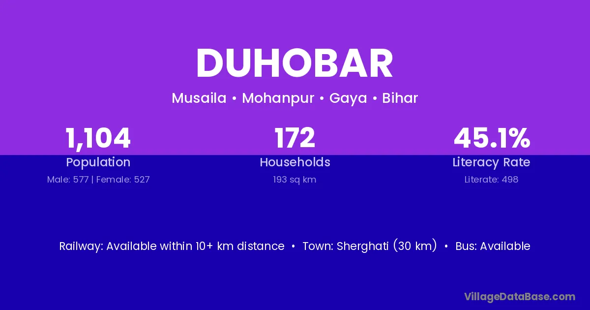 Sherghati (30 km) is the nearest town to Duhobar village for major economic activities and is located approximately 30 km away.