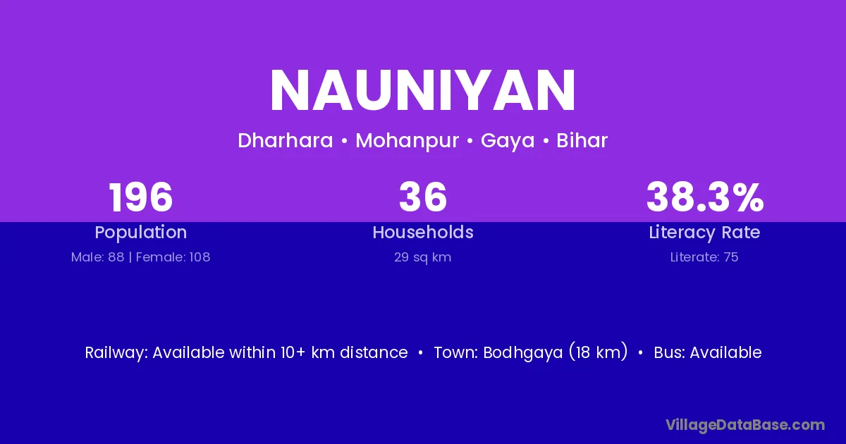 Bodhgaya (18 km) is the nearest town to Nauniyan village for major economic activities and is located approximately 18 km away.