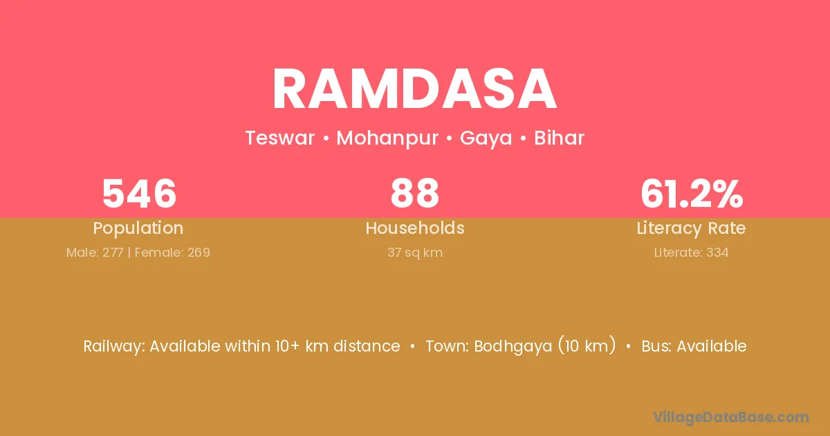 Bodhgaya (10 km) is the nearest town to Ramdasa village for major economic activities and is located approximately 10 km away.