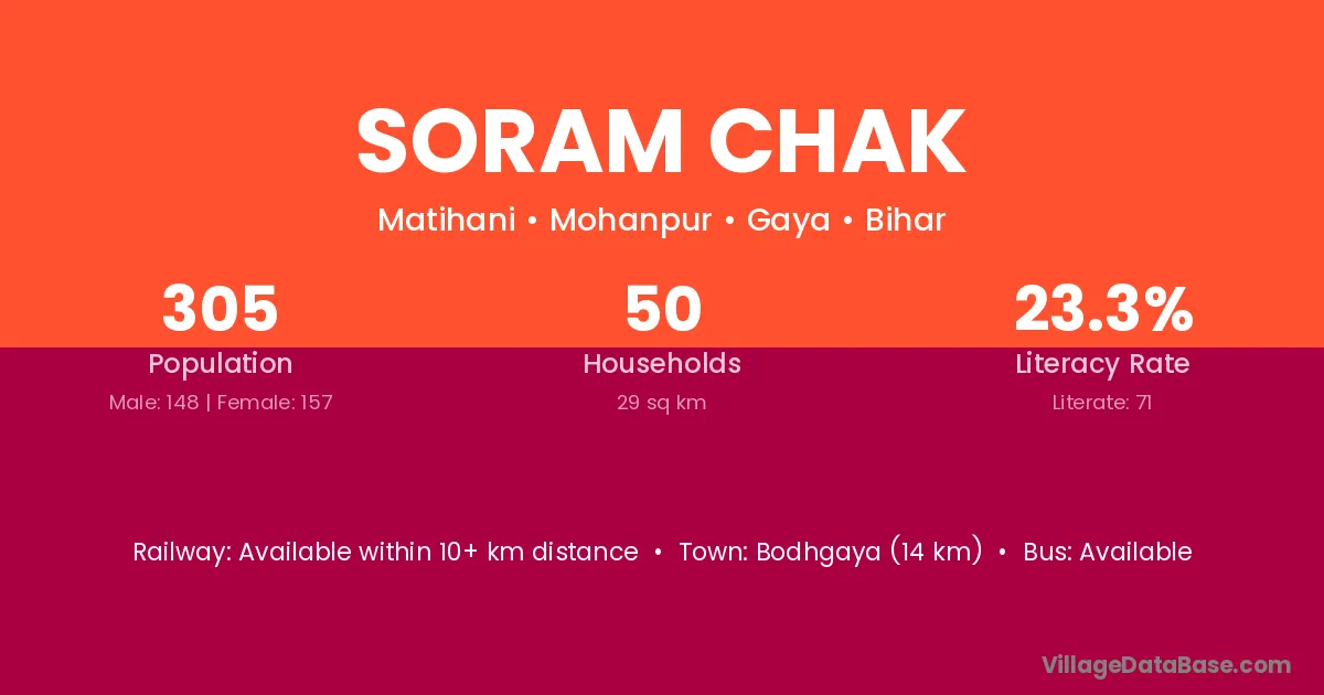Bodhgaya (14 km) is the nearest town to Soram Chak village for major economic activities and is located approximately 14 km away.
