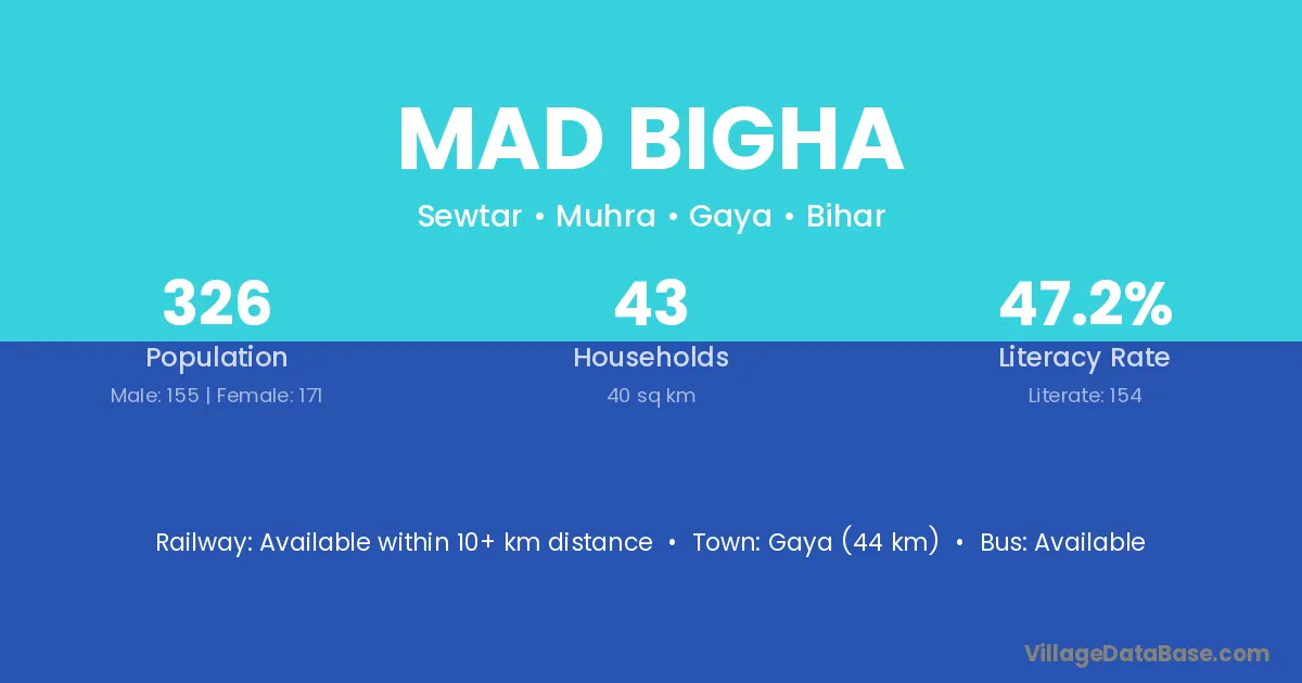 Mad Bigha village has a total population of 326 people, of which 155 are males and 171 are females.