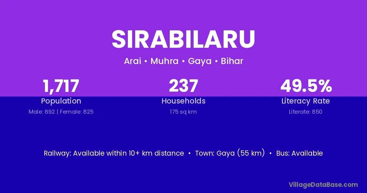 Gaya (55 km) is the nearest town to Sirabilaru village for major economic activities and is located approximately 55 km away.