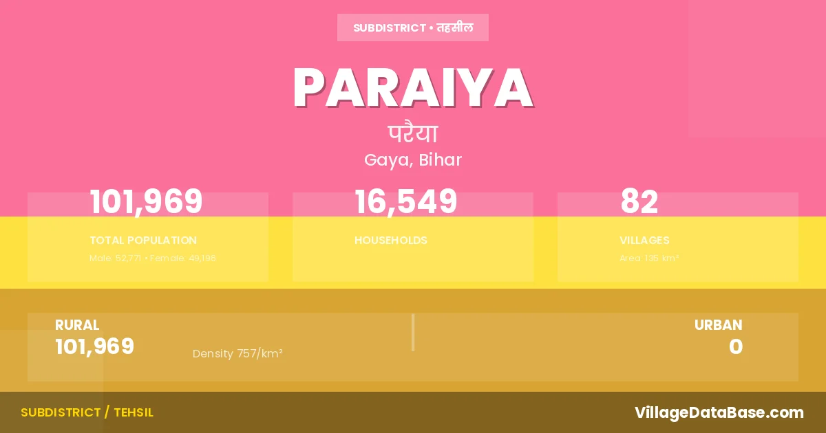 According to the 2011 census The total area of Paraiya Subdivision is 135 km², with a population of 101969 people. The population density is 757 inhabitants per square kilometre, and there are approximately 16549 houses in the sub district.