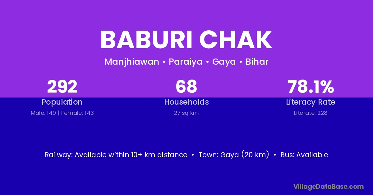 Gaya (20 km) is the nearest town to Baburi Chak village for major economic activities and is located approximately 20 km away.
