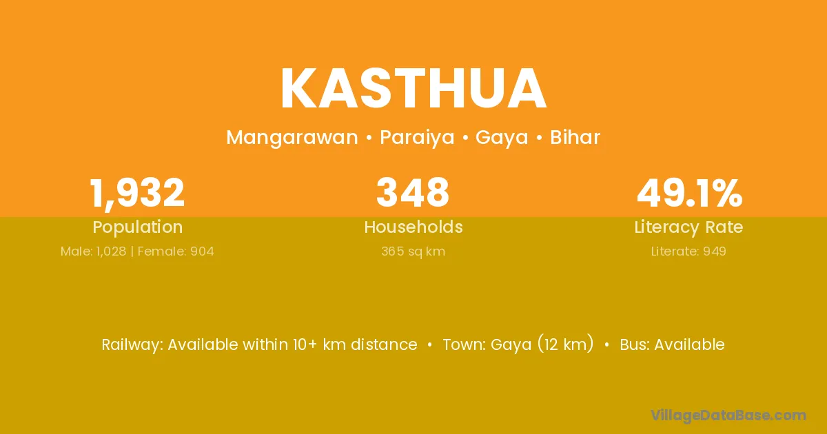 Gaya (12 km) is the nearest town to Kasthua village for major economic activities and is located approximately 12 km away.