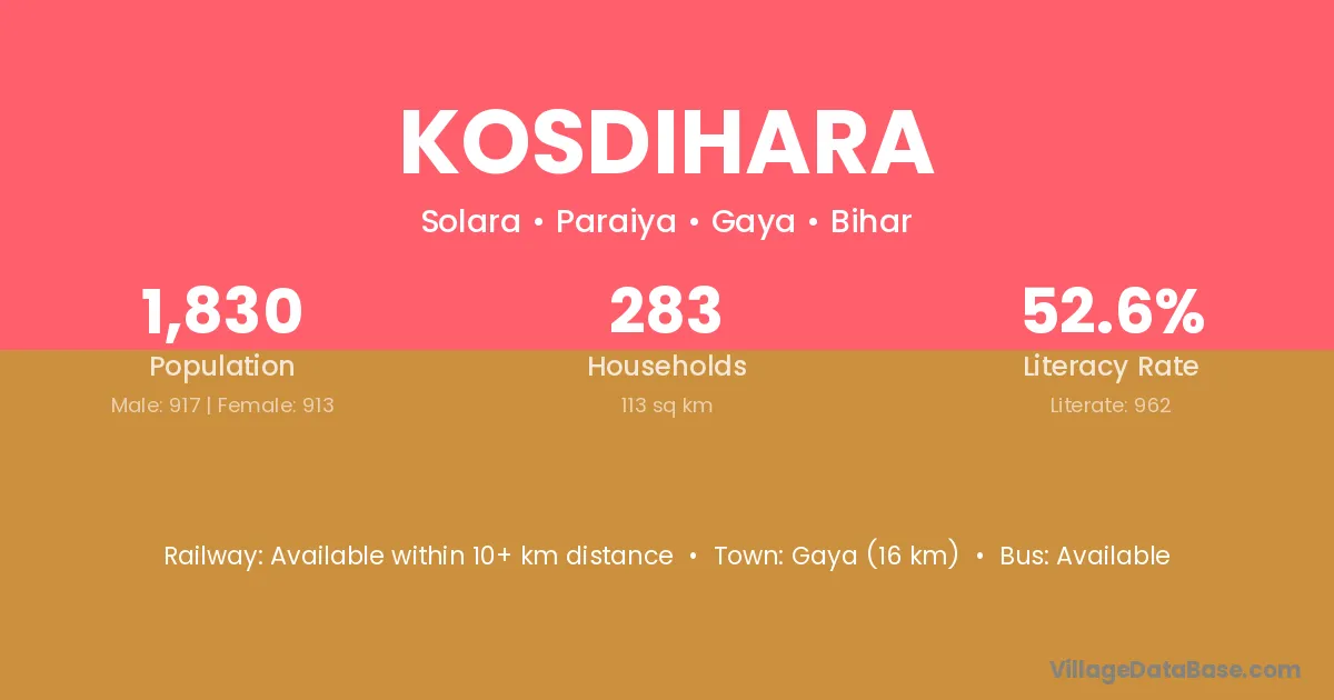 Gaya (16 km) is the nearest town to Kosdihara village for major economic activities and is located approximately 16 km away.