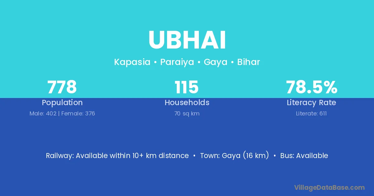 Gaya (16 km) is the nearest town to Ubhai village for major economic activities and is located approximately 16 km away.