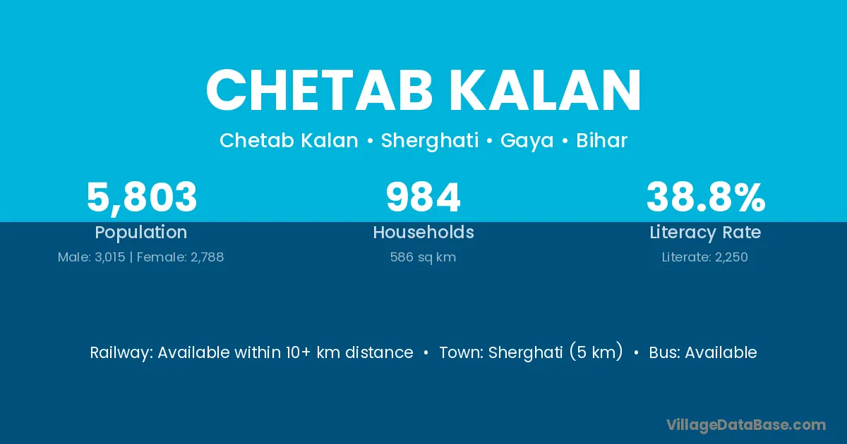 Sherghati (5 km) is the nearest town to Chetab Kalan village for major economic activities and is located approximately 5 km away.