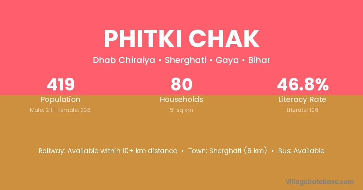 Phitki Chak village has a total population of 419 people, of which 211 are males and 208 are females.