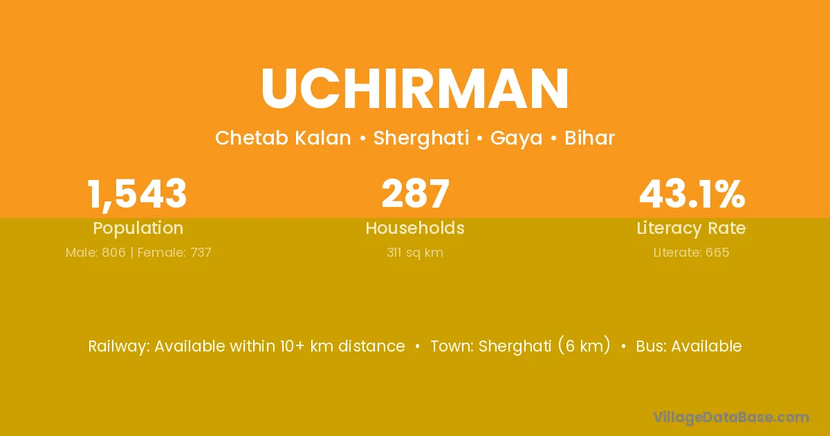 Sherghati (6 km) is the nearest town to Uchirman village for major economic activities and is located approximately 6 km away.