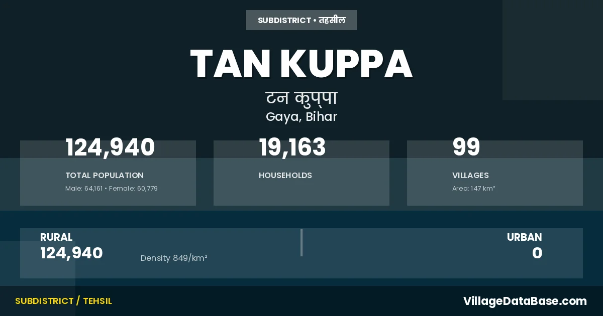 Tan Kuppa is a town and Subdivision in the Gaya district of the Bihar. In India, a Subdivision is a subdivision of a district responsible for the administration and revenue collection of a specific area within the district. Subdivisions play a crucial role in the local governance structure, contributing significantly to the development and administration of their communities.
