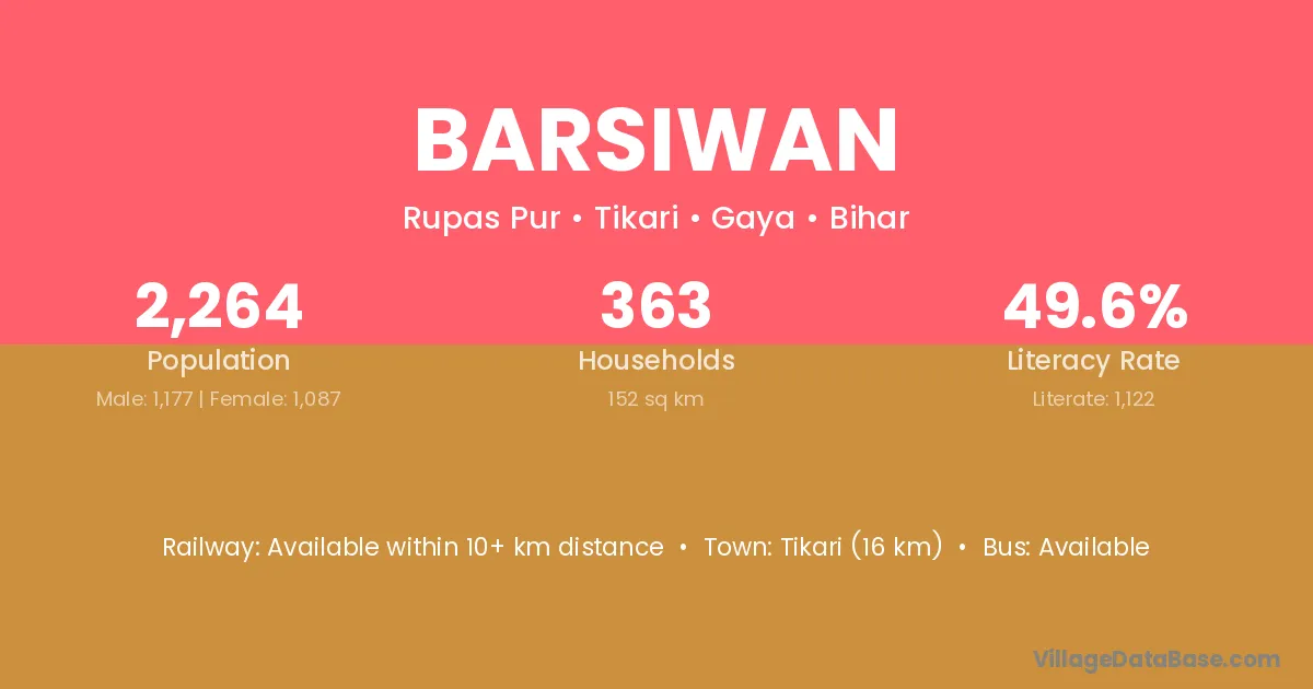 Gaya (25 km) is the nearest town to Barsiwan village for major economic activities and is located approximately 25 km away.