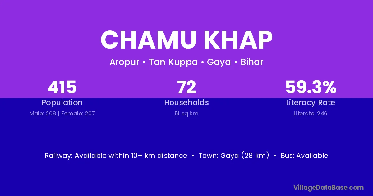 Gaya (28 km) is the nearest town to Chamu Khap village for major economic activities and is located approximately 28 km away.