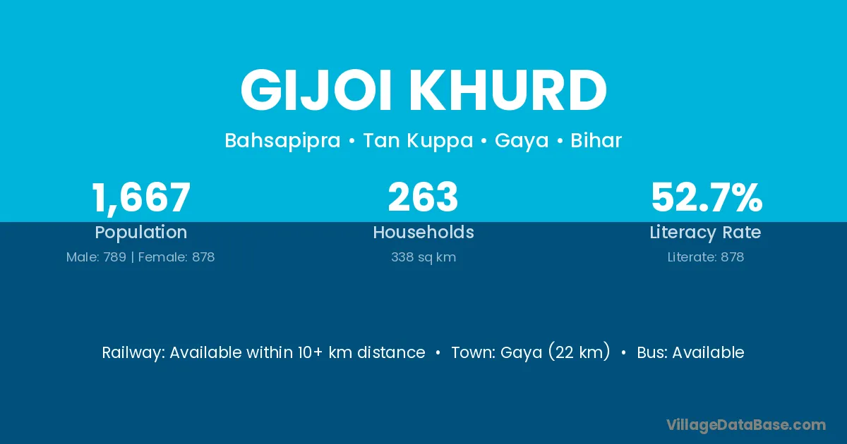 Gaya (22 km) is the nearest town to Gijoi Khurd village for major economic activities and is located approximately 22 km away.