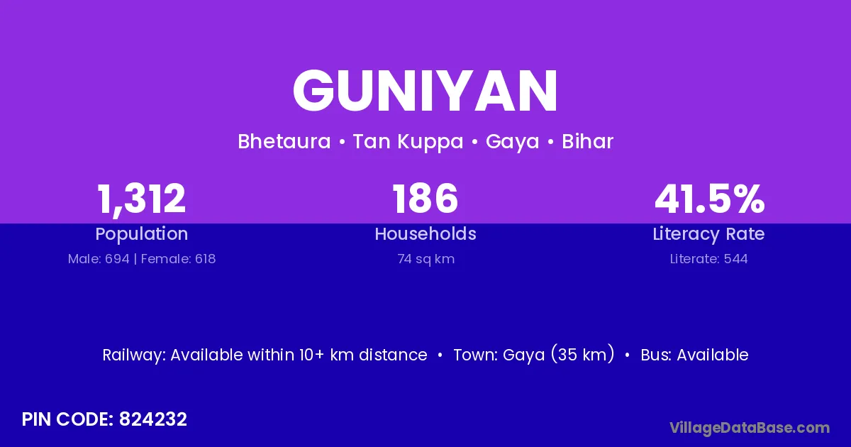 Gaya (35 km) is the nearest town to Guniyan village for major economic activities and is located approximately 35 km away.