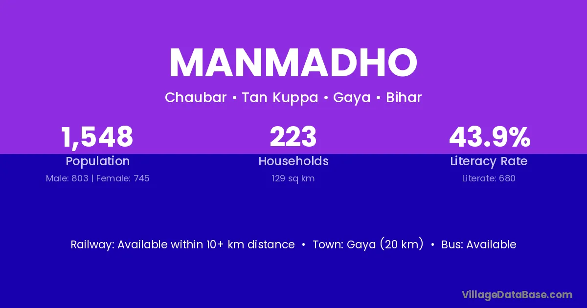 Gaya (20 km) is the nearest town to Manmadho village for major economic activities and is located approximately 20 km away.