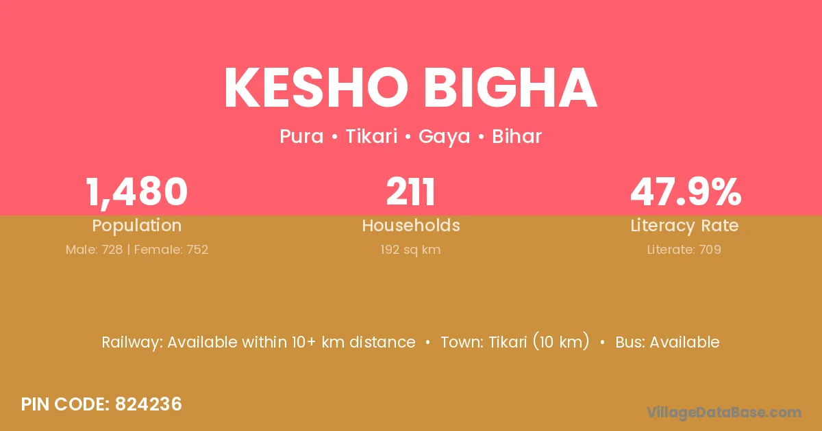 Kesho Bigha village has a total population of 1,480 people, of which 728 are males and 752 are females.