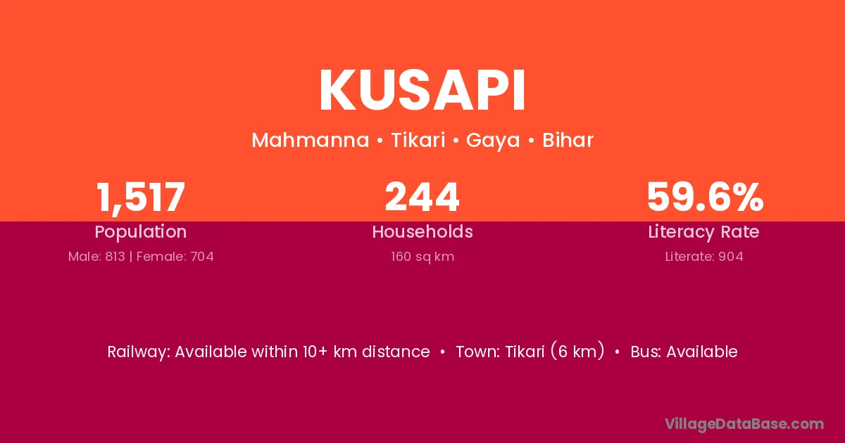 Tikari (6 km) is the nearest town to Kusapi village for major economic activities and is located approximately 6 km away.