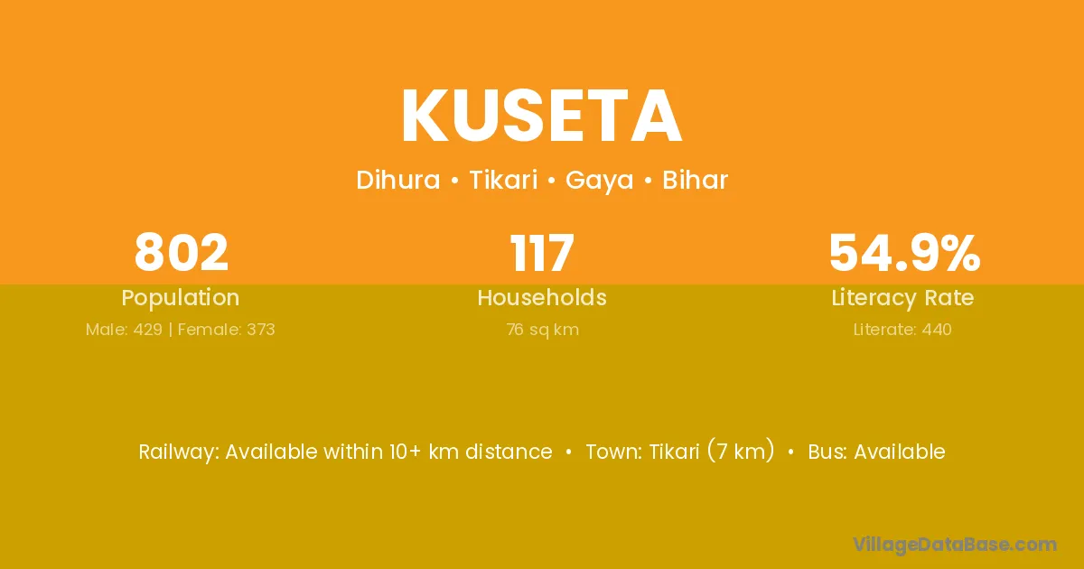 Kuseta village has a total population of 802 people, of which 429 are males and 373 are females.