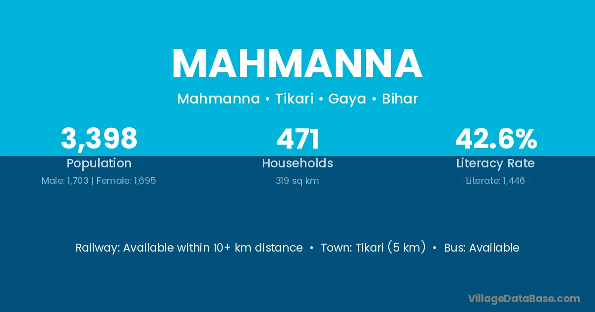 Tikari (5 km) is the nearest town to Mahmanna village for major economic activities and is located approximately 5 km away.