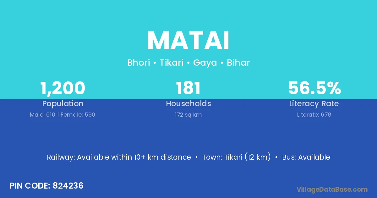 Tikari (12 km) is the nearest town to Matai village for major economic activities and is located approximately 12 km away.