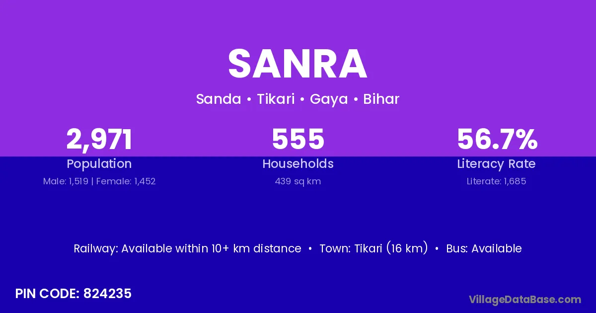 Tikari (16 km) is the nearest town to Sanra village for major economic activities and is located approximately 16 km away.
