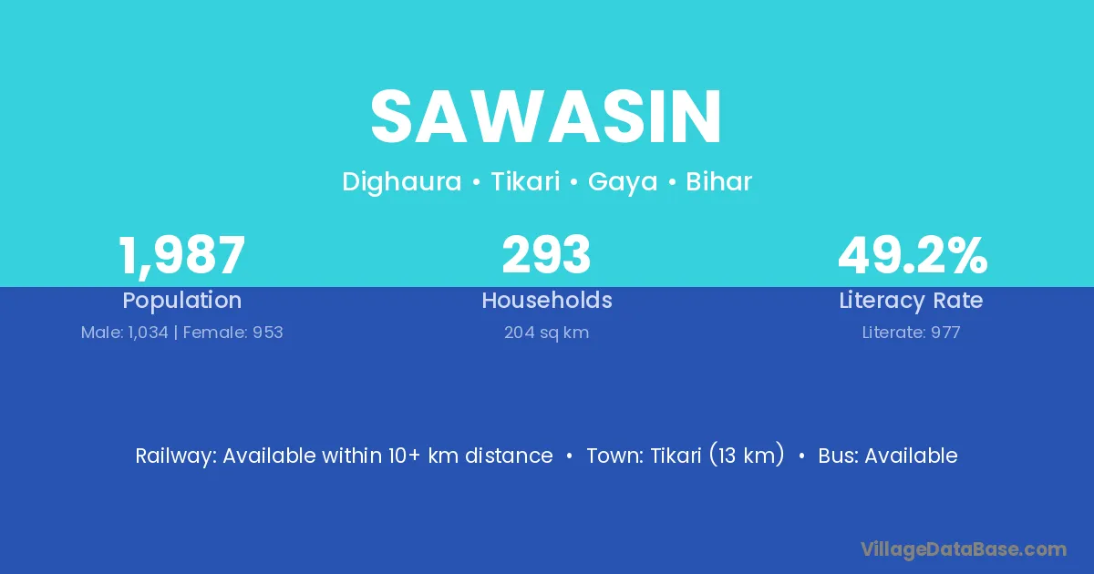 Tikari (13 km) is the nearest town to Sawasin village for major economic activities and is located approximately 13 km away.