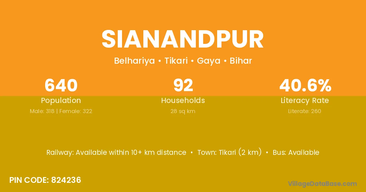 Tikari (2 km) is the nearest town to Sianandpur village for major economic activities and is located approximately 2 km away.