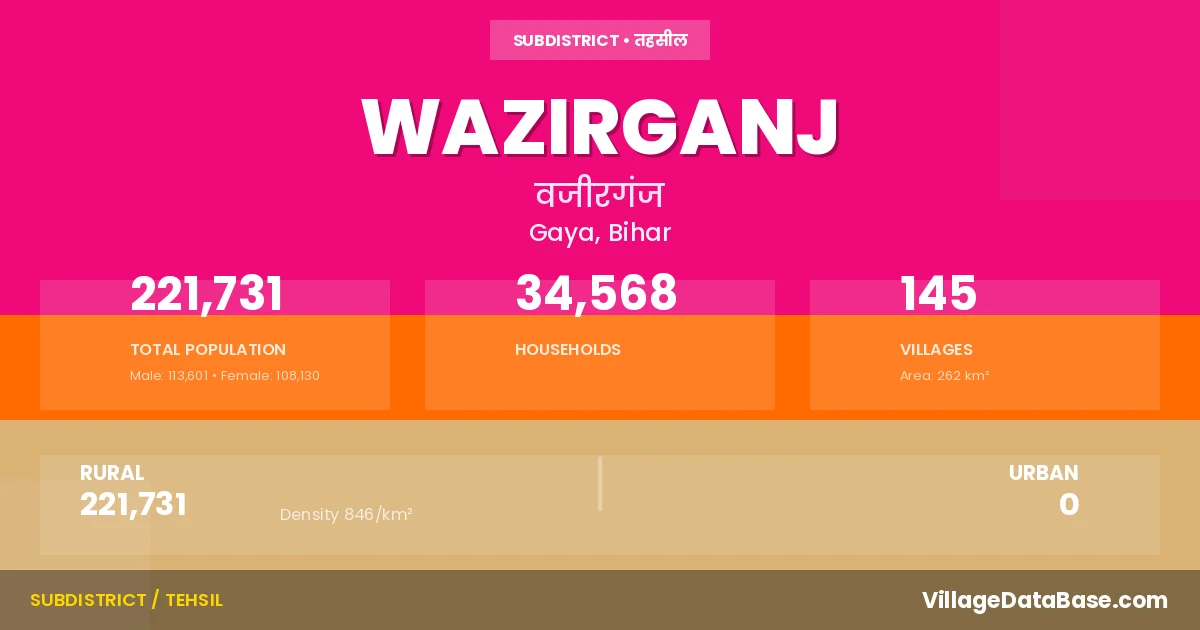 According to the 2011 census The total area of Wazirganj Subdivision is 262 km², with a population of 221731 people. The population density is 846 inhabitants per square kilometre, and there are approximately 34568 houses in the sub district.