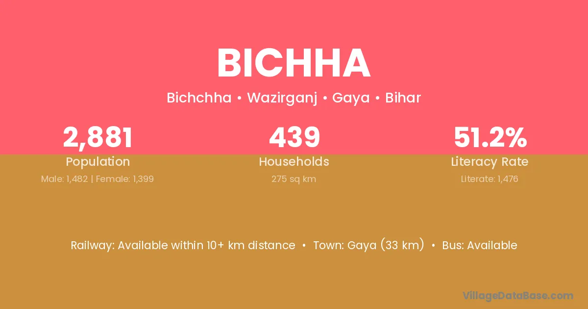 Gaya (33 km) is the nearest town to Bichha village for major economic activities and is located approximately 33 km away.