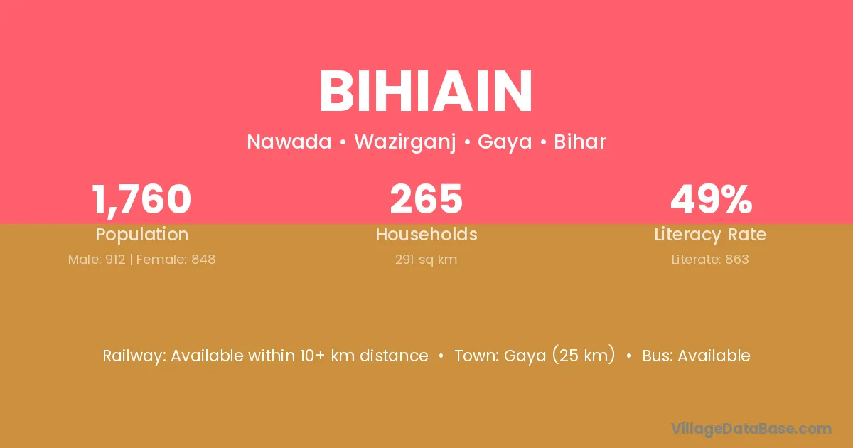 Gaya (25 km) is the nearest town to Bihiain village for major economic activities and is located approximately 25 km away.
