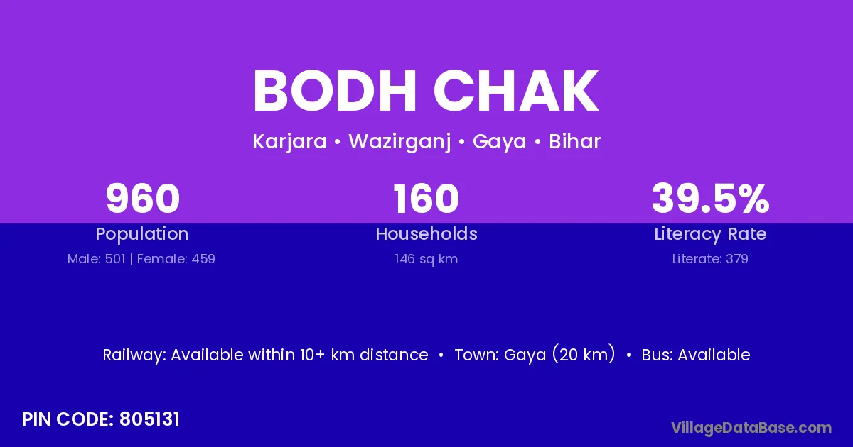 Gaya (20 km) is the nearest town to Bodh Chak village for major economic activities and is located approximately 20 km away.
