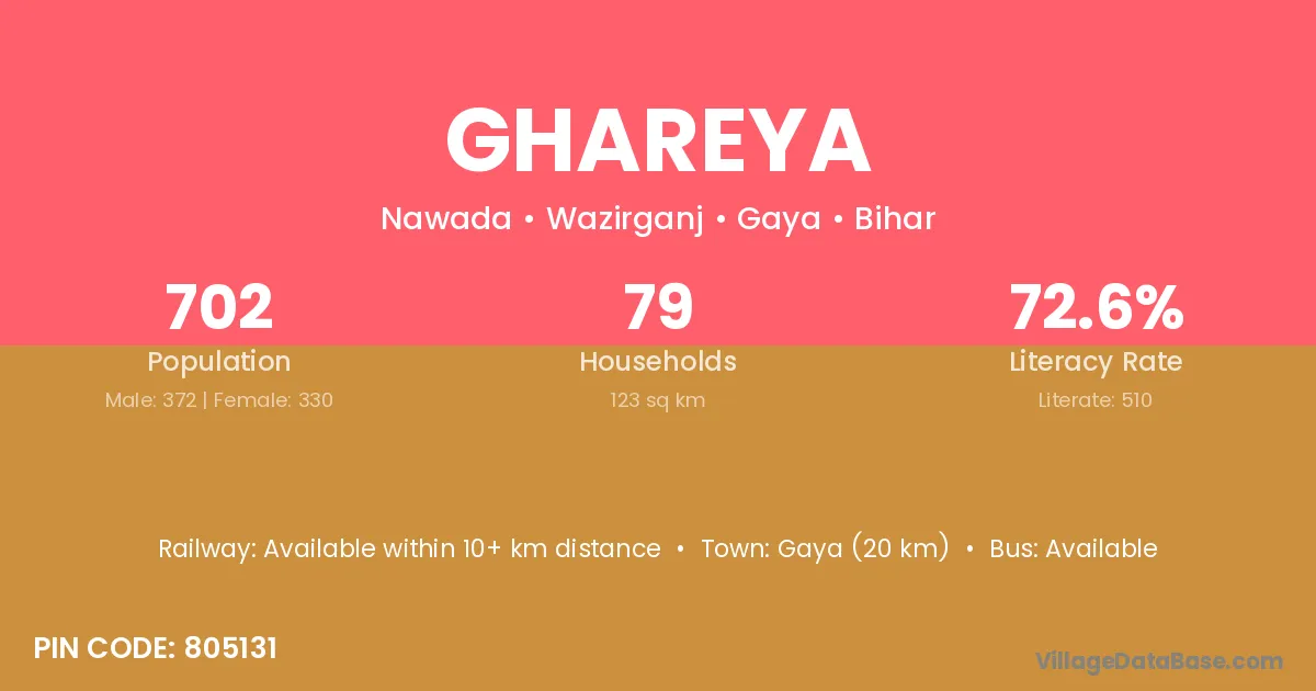 Gaya (20 km) is the nearest town to Ghareya village for major economic activities and is located approximately 20 km away.