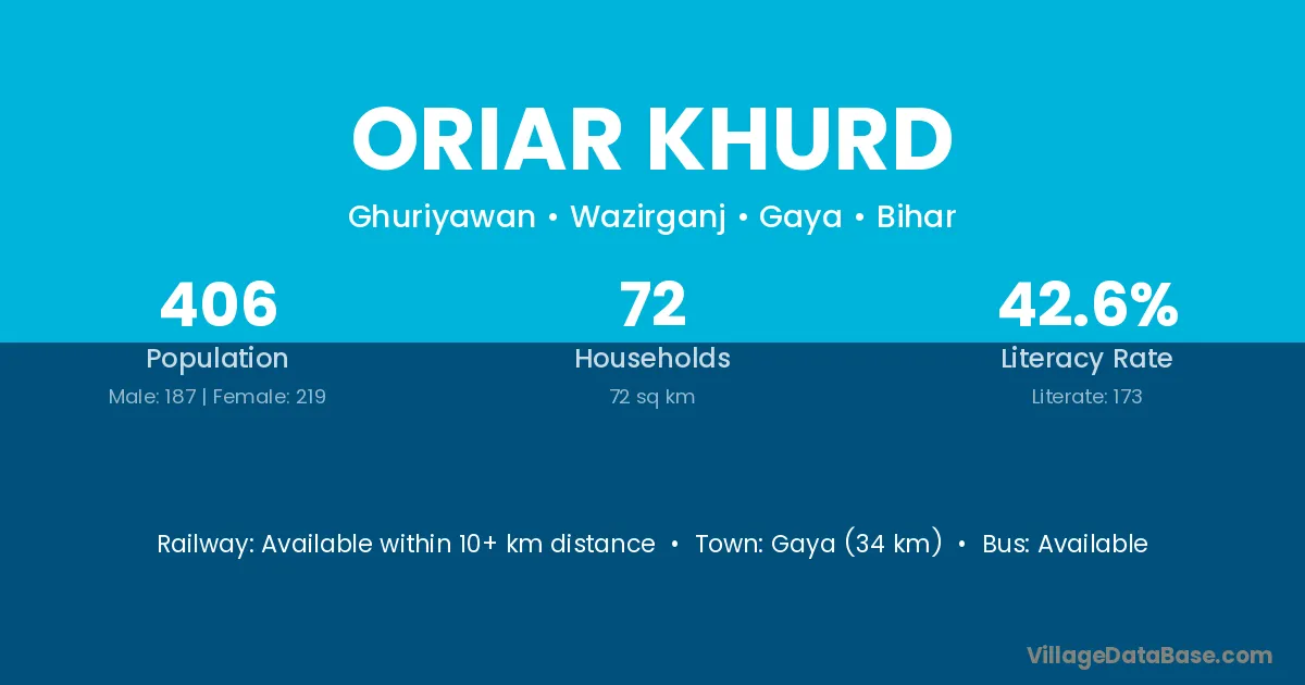 Gaya (34 km) is the nearest town to Oriar Khurd village for major economic activities and is located approximately 34 km away.