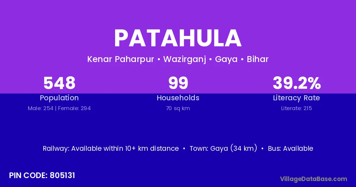 Gaya (34 km) is the nearest town to Patahula village for major economic activities and is located approximately 34 km away.
