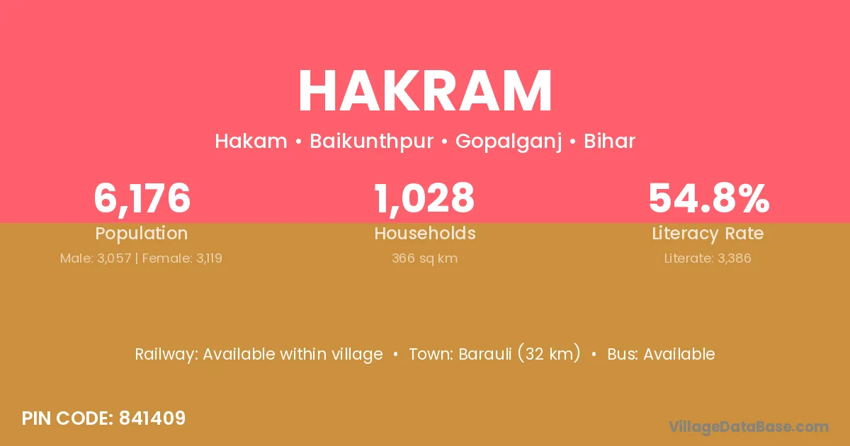 Barauli (32 km) is the nearest town to Hakram village for major economic activities and is located approximately 32 km away.