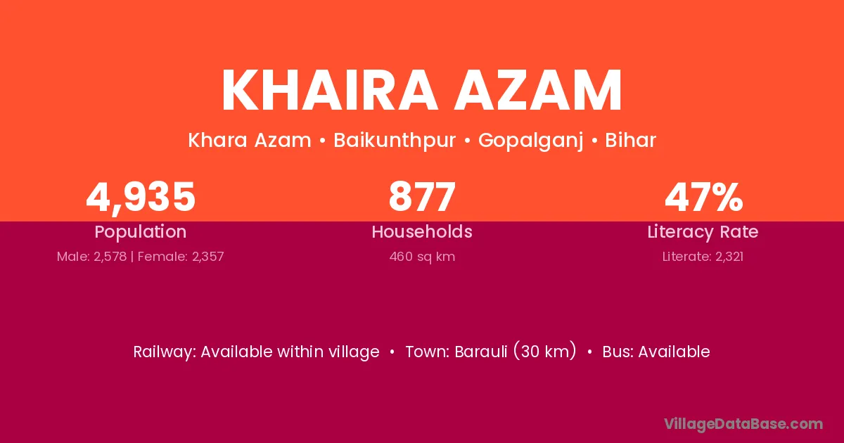 Barauli (30 km) is the nearest town to Khaira Azam village for major economic activities and is located approximately 30 km away.