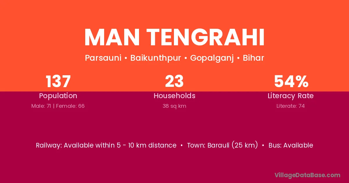 Barauli (25 km) is the nearest town to Man Tengrahi village for major economic activities and is located approximately 25 km away.