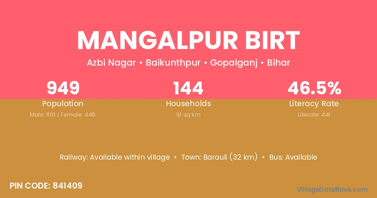 Mangalpur Birt village has a total population of 949 people, of which 501 are males and 448 are females.