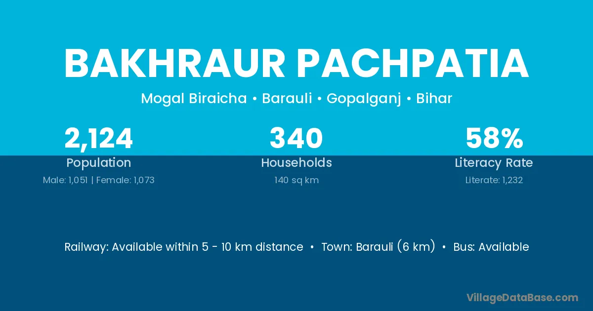 Barauli (6 km) is the nearest town to Bakhraur Pachpatia village for major economic activities and is located approximately 6 km away.