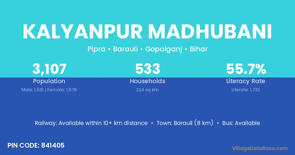 Barauli (8 km) is the nearest town to Kalyanpur Madhubani village for major economic activities and is located approximately 8 km away.