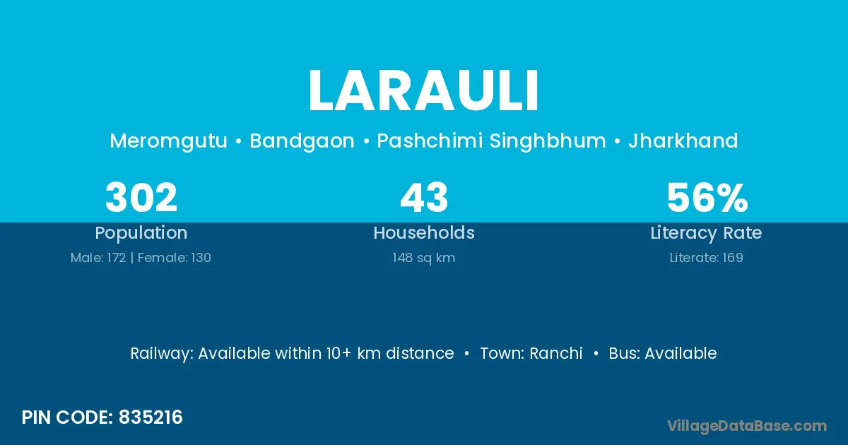 The literacy rate of Larauli village is 52.59%. Male literacy stands at 63.73% and female literacy at 42.51%.