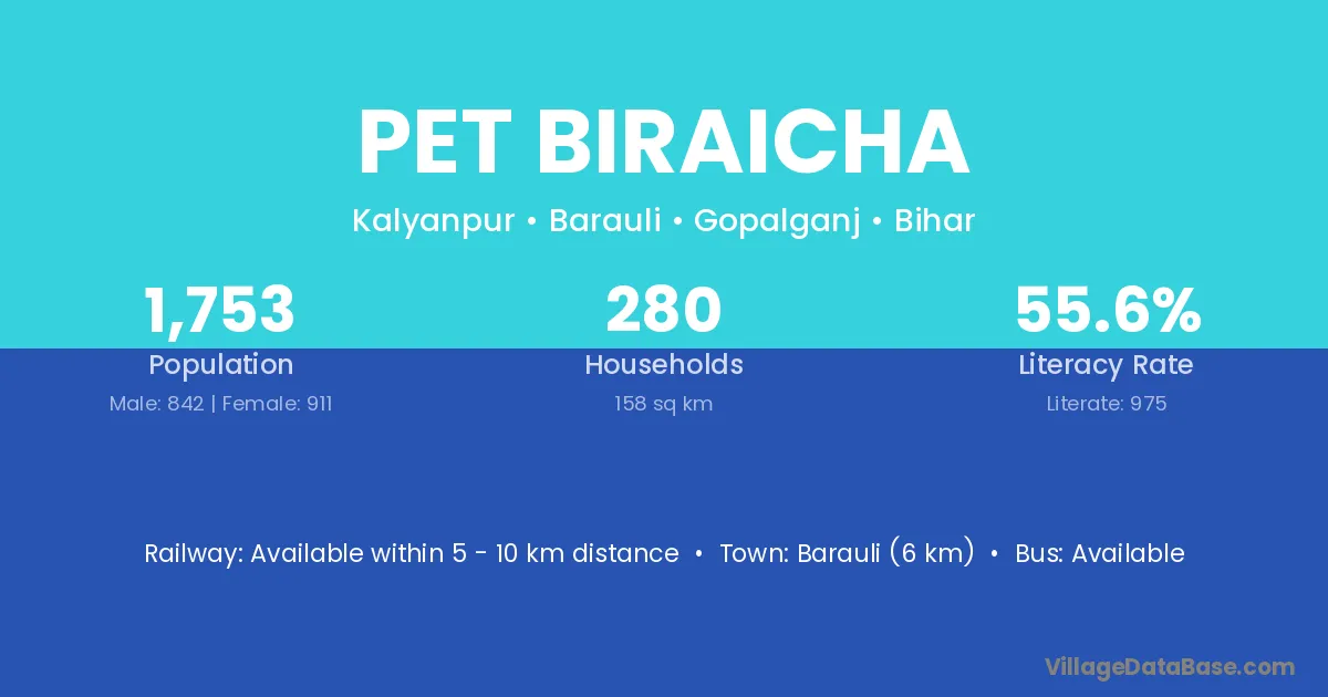 Barauli (6 km) is the nearest town to Pet Biraicha village for major economic activities and is located approximately 6 km away.