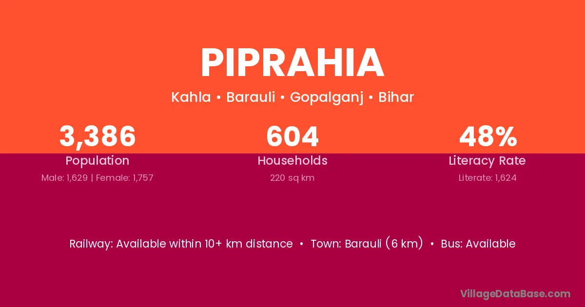 Barauli (6 km) is the nearest town to Piprahia village for major economic activities and is located approximately 6 km away.