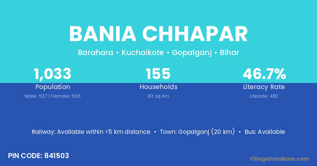 Kataiya (20 km) is the nearest town to Bania Chhapar village for major economic activities and is located approximately 20 km away.