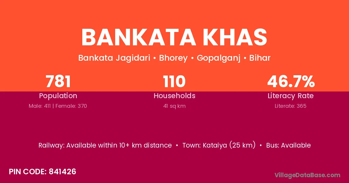 Bankata Khas village has a total population of 781 people, of which 411 are males and 370 are females.