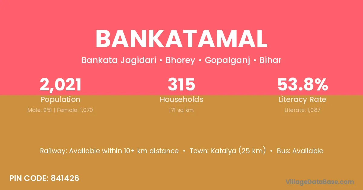 Kataiya (25 km) is the nearest town to Bankatamal village for major economic activities and is located approximately 25 km away.