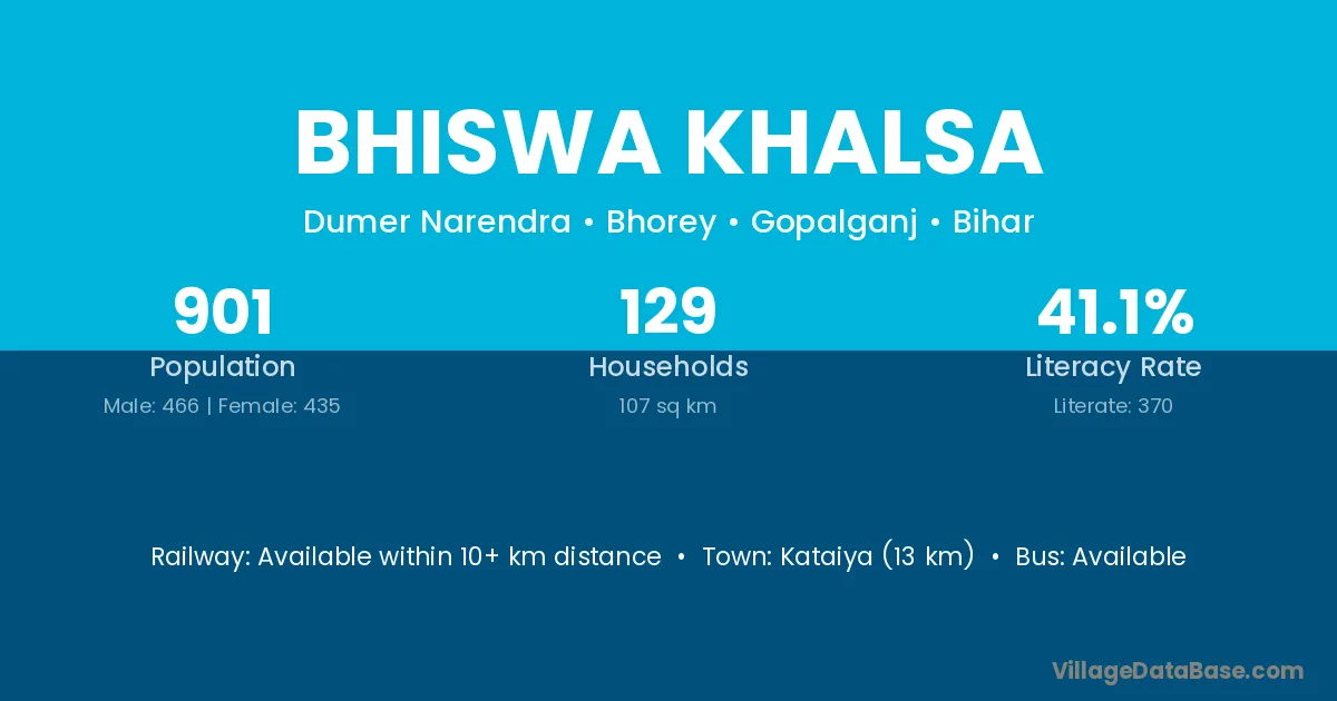 Kataiya (13 km) is the nearest town to Bhiswa Khalsa village for major economic activities and is located approximately 13 km away.