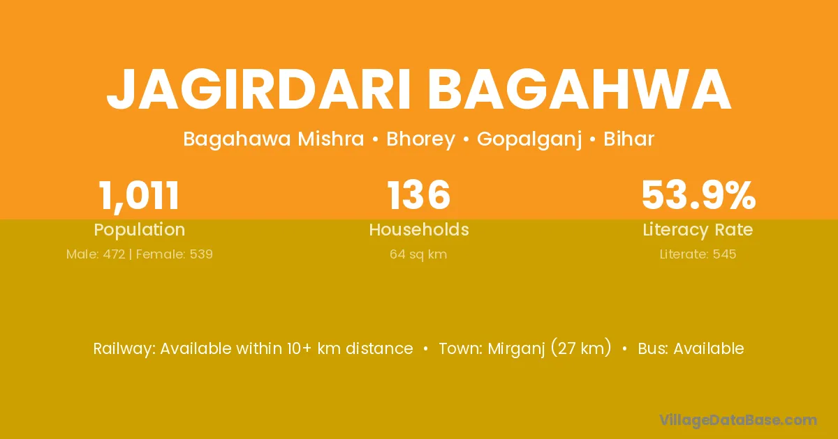 Jagirdari Bagahwa village has a total population of 1,011 people, of which 472 are males and 539 are females.