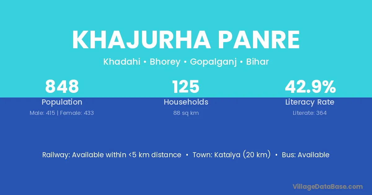 Kataiya (20 km) is the nearest town to Khajurha Panre village for major economic activities and is located approximately 20 km away.